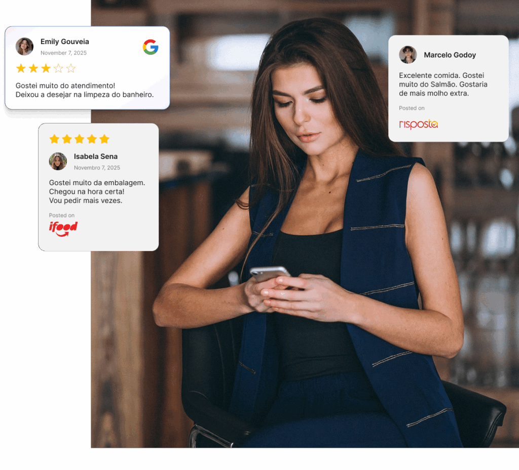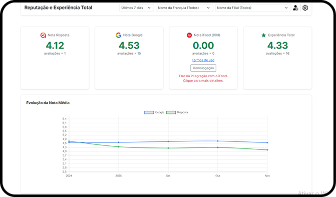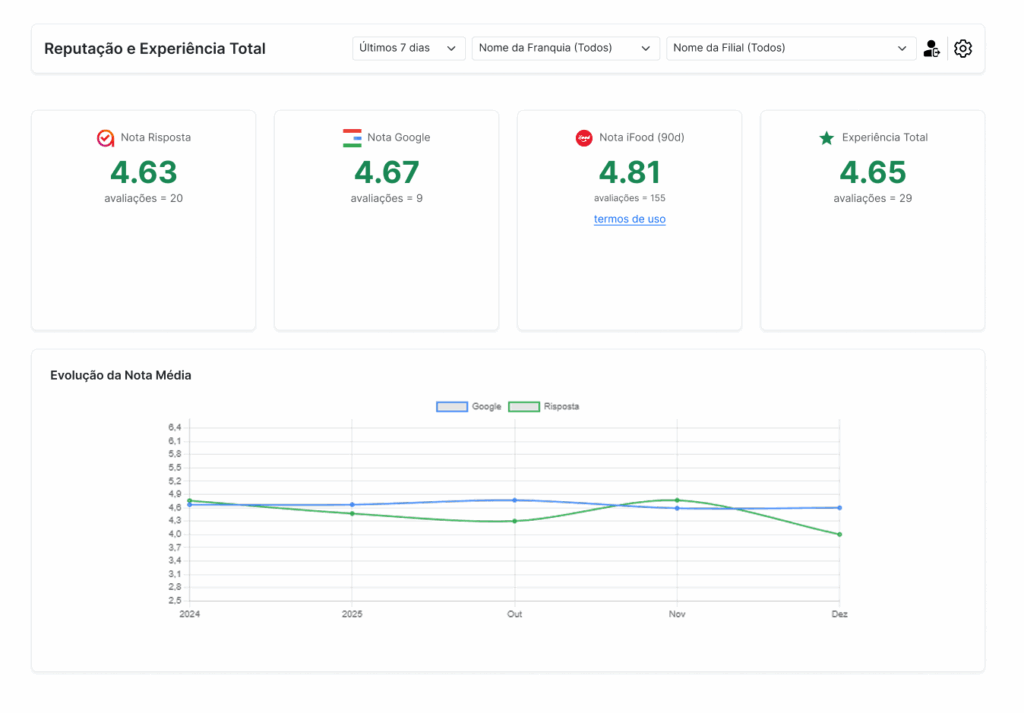 Acompanhe avaliações do Google, Risposta e Ifood em um único painel. Veja tendências, alertas e quedas de satisfação imediatamente, sem precisar acessar várias plataformas.